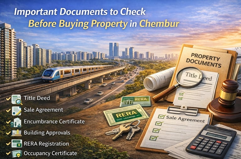 Purchasing property in Chembur offers strong investment potential due to infrastructure growth, metro connectivity, and rising residential demand. However, thorough document verification is essential to avoid legal complications and financial risks. From title deeds and encumbrance certificates to RERA registration and occupancy certificates, each document plays a crucial role in safeguarding your investment.